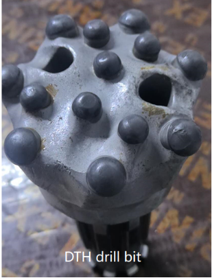 The DTH drill bit installed with PDC button, has been applied to a quarry abroad, drilling into granite formations for making blasting holes.
